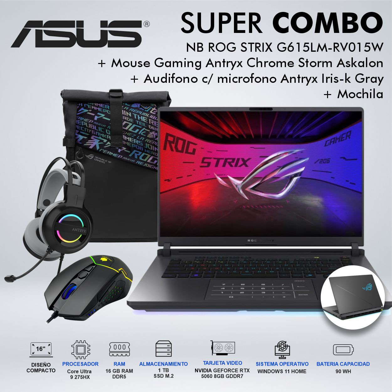 LAPTOP ASUS ROG STRIX G615LM-RV015W 16 PULGADAS CORE ULTRA 9 275HX MEMORIA 16GB DISCO 1TB SSD M.2 | Plazavea